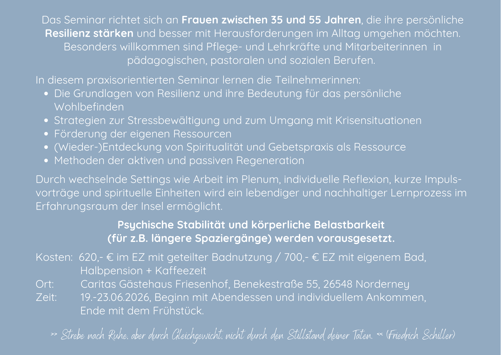 Resilienz stärken – Spiritualität entdecken. Für Frauen zwischen 35 und 55, die sich ihren Kraftquellen widmen wollen.